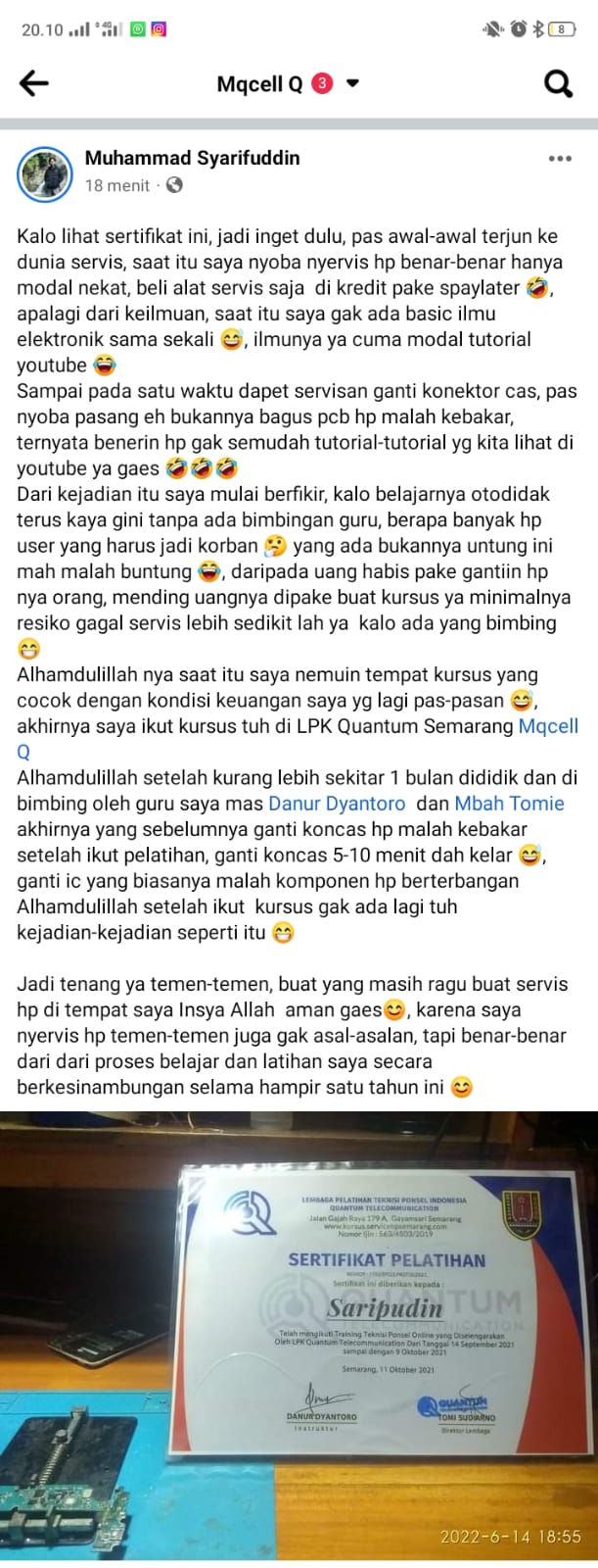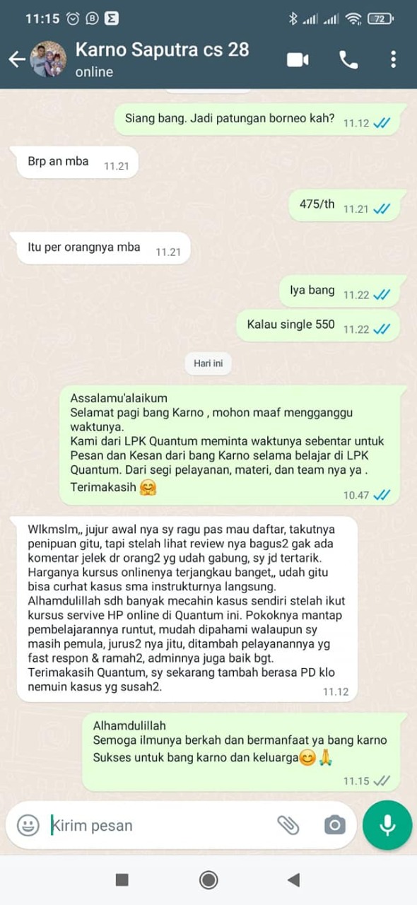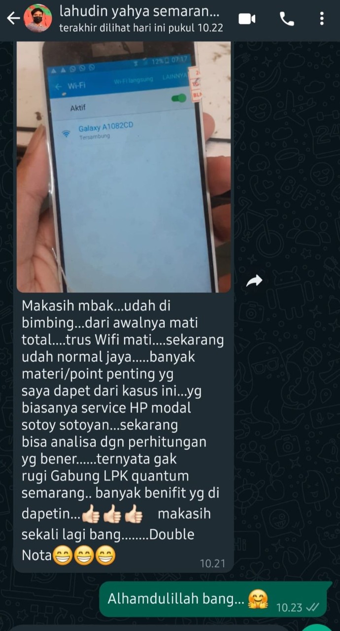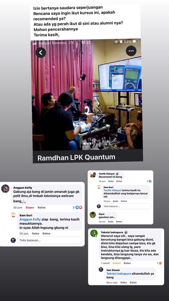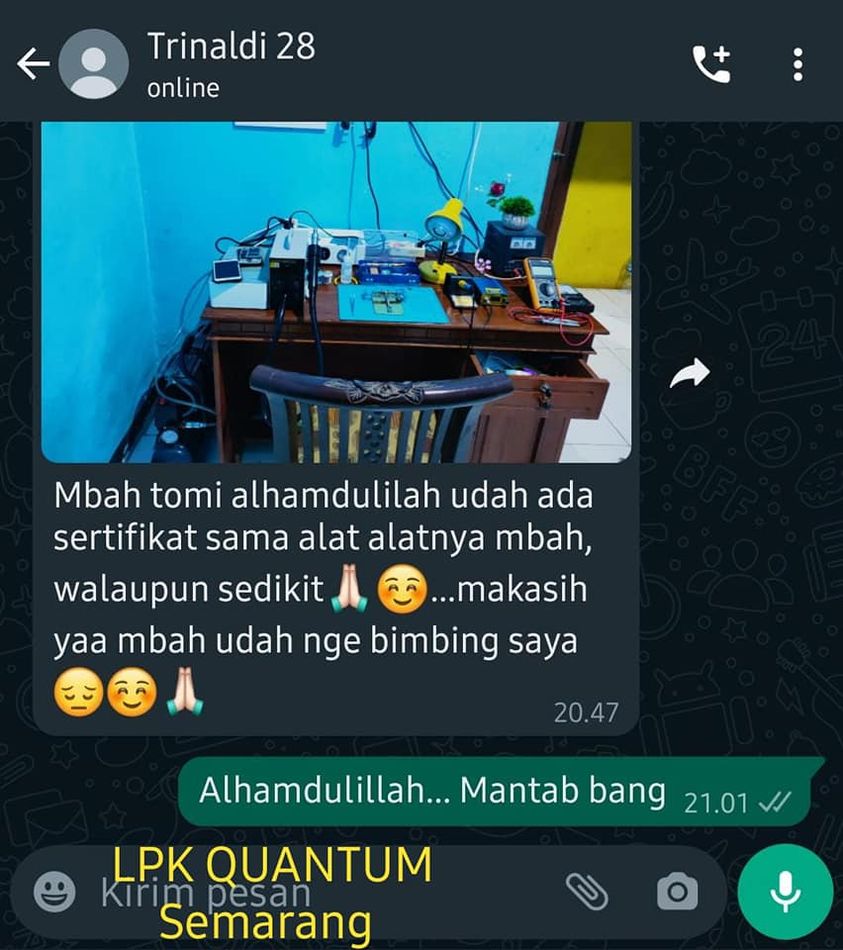 Kami Adalah Lembaga Pelatihan Kerja Swasta merupakan Tempat Pelatihan / Tempat kursus / Sekolah Teknisi Smartphone sejak Tahun 2000. Alhamdulillah saat ini LPK QUANTUM TELECOMMUNICATION telah berhasil mencetak ribuan Alumni yang tersebar di se-Indonesia sebagai pengusaha dan Teknisi Handphone yang trampil dan siap kerja maupun sebagai Pengusaha mandiri sukses profesional.